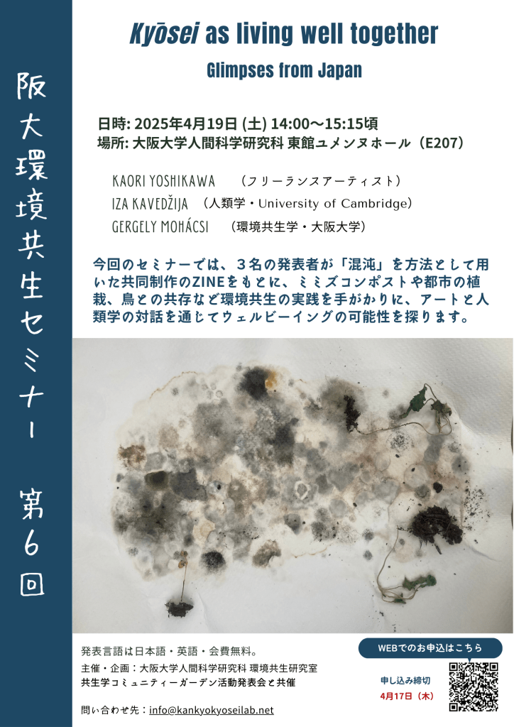 Environmental Coexistence Seminar Series ー 6 Posted bykankyolabApril 13, 2025September 25, 2025Posted in環境共生セミナー, WORKSHOPS, 共生Tags:art, kyosei, multispecies, wellbeing, 共生 Share this: Click to share on X (Opens in new window) X Click to share on Facebook (Opens in new window) Facebook Like Loading... Related