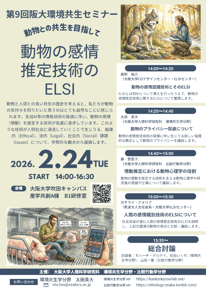 Environmental Coexistence Seminar Series — 9 Posted bykankyolabFebruary 18, 2026February 26, 2026Posted in環境共生セミナー, WORKSHOPS, 共生Tags:animalrights, elsi, emotion Share this: Share on X (Opens in new window) X Share on Facebook (Opens in new window) Facebook Like Loading... Related