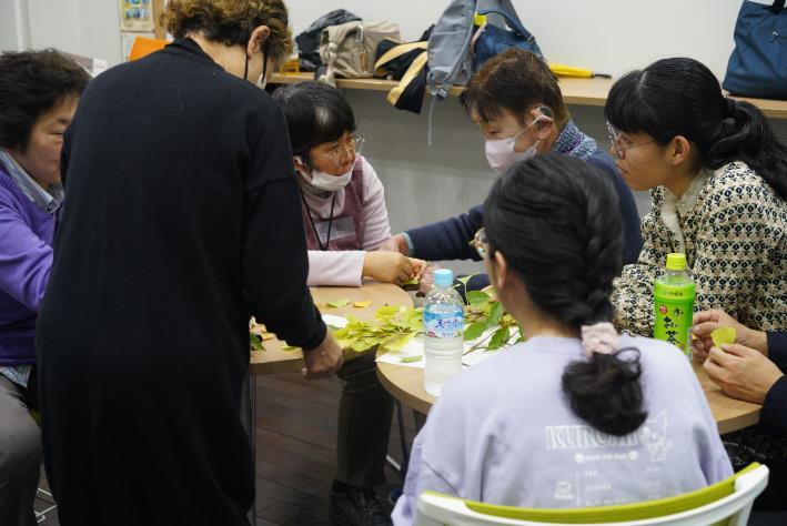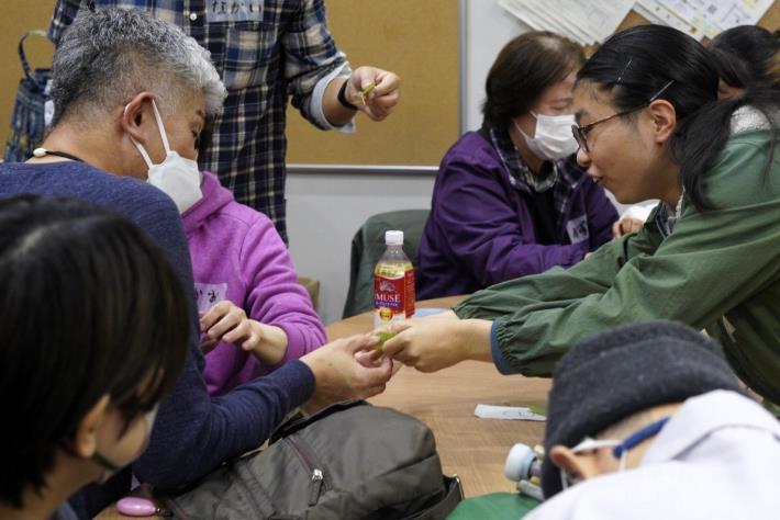 今回は、大阪市天王寺区にて盲ろう者の方々の支援に取り組まれているNPO法人ヘレンケラー自立支援センターすまいるのみなさんを大学にお招きし、学生、学外参加者などを交え、約50名で実施しました。お天気はあいにくの雨となってしまいましたが、室内で植物の葉や実の手触りなどを「感」察したり、チーム対抗でどんぐりの重さを当てるゲームをしたりして、楽しいひとときを過ごしました。